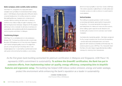 features and ergonomic setup. The building has helped UOB reduce carbon emission, energy and water wastage,