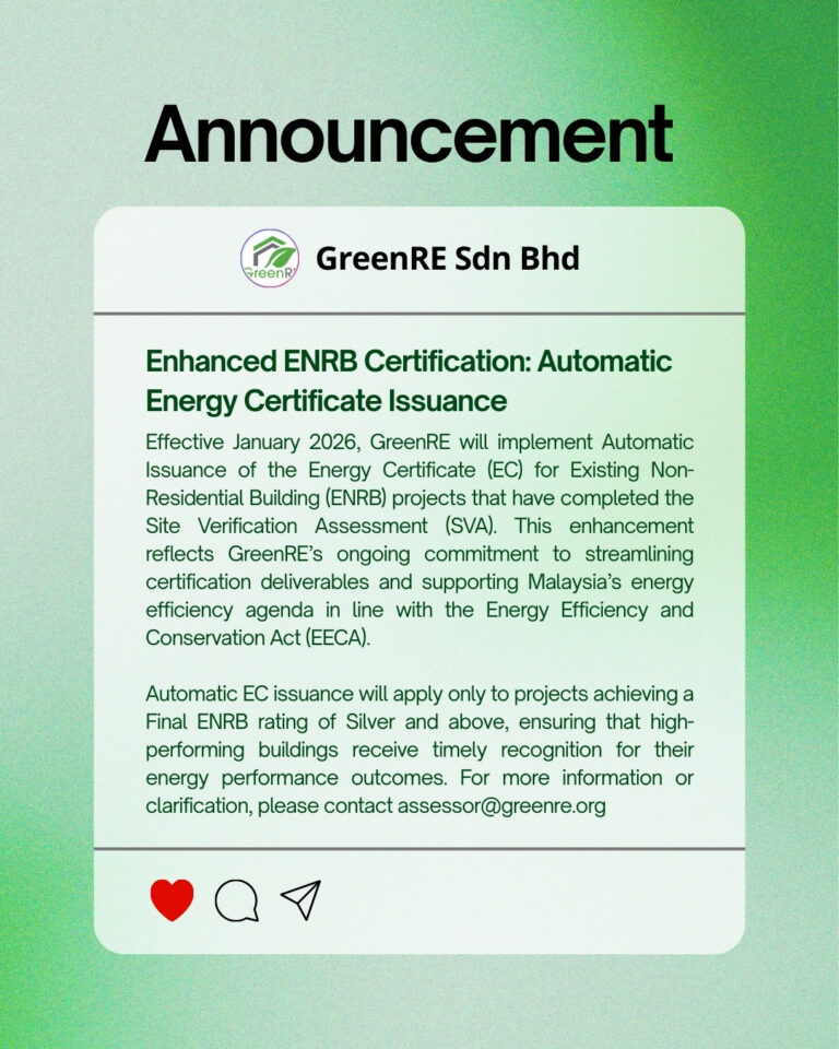 GreenRE was formed by Malaysia’s Real Estate and Housing Developers’ Association (REHDA) in 2013 to promote sustainability in Malaysia’s property development sector.