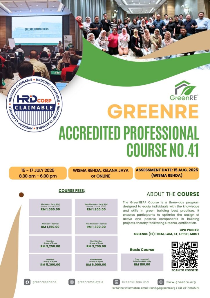 Event Date: 15/07/2025 – 17/07/2025 Save the Date! The GreenRE Accredited Professional's Course – 41st Intake is coming soon to Petaling Jaya! Join us for this exclusive opportunity to advance your expertise in sustainable building practices and help shape a greener future. Don’t miss out on this step towards becoming a sustainability leader.