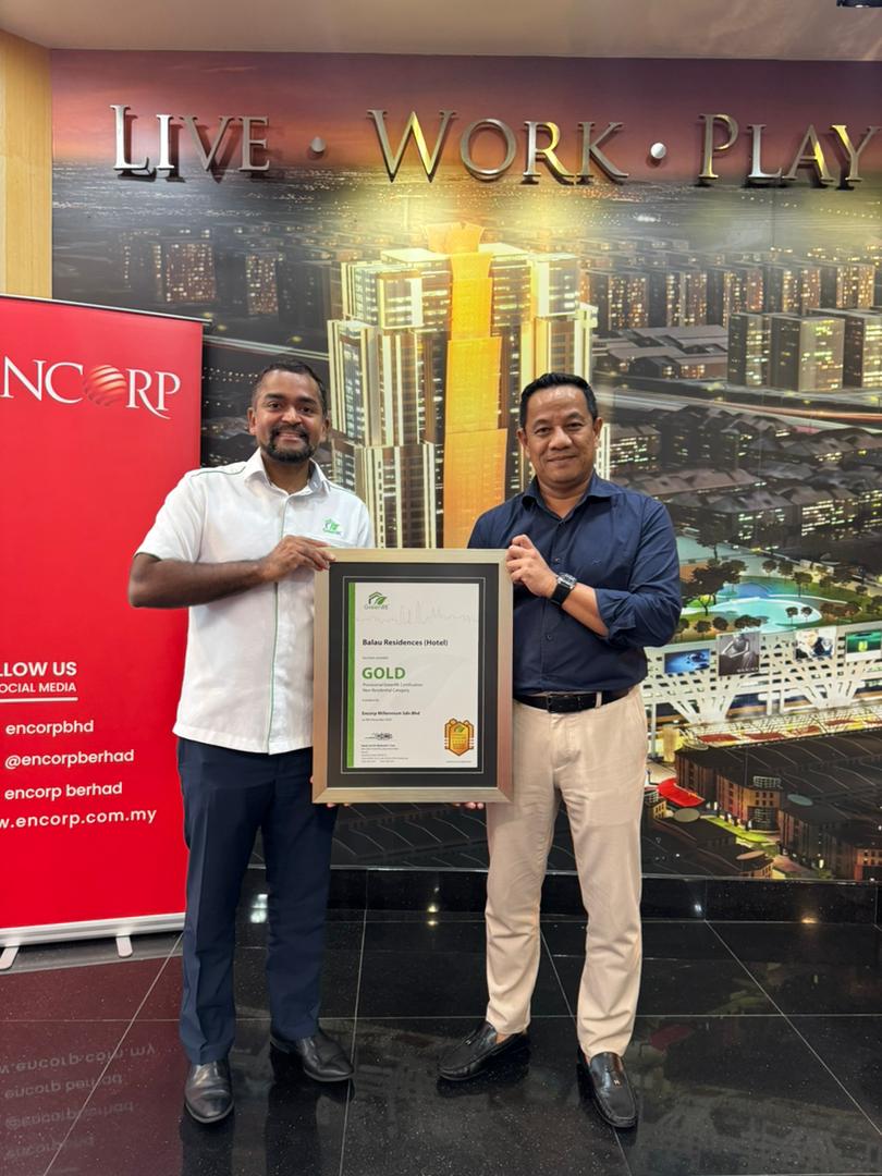 GreenRE recently presented the GreenRE Gold Award Rating to Encorp Millenium Sdn Bhd for Balau Residences (Hotel), certified under the Non-Residential Building (NRB v3.3) category.