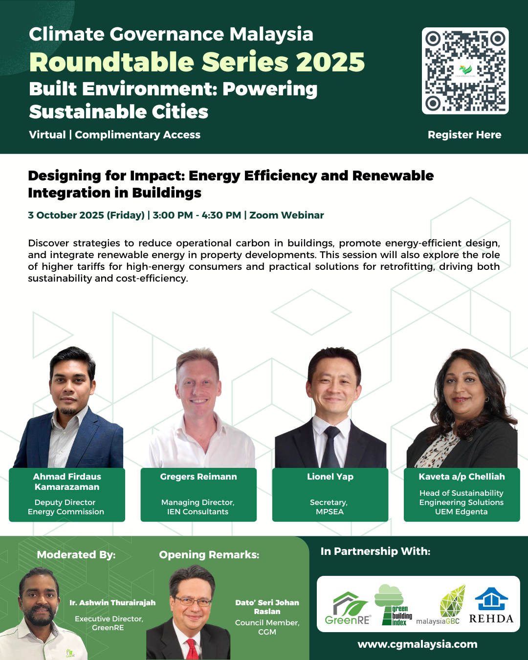On 3 October 2025, GreenRE’s Executive Director, Ir. Ashwin Thurairajah, moderated the session titled “Designing for Impact: Energy Efficiency and Renewable Integration in Buildings”, organised by Climate Governance Malaysia (CGM).